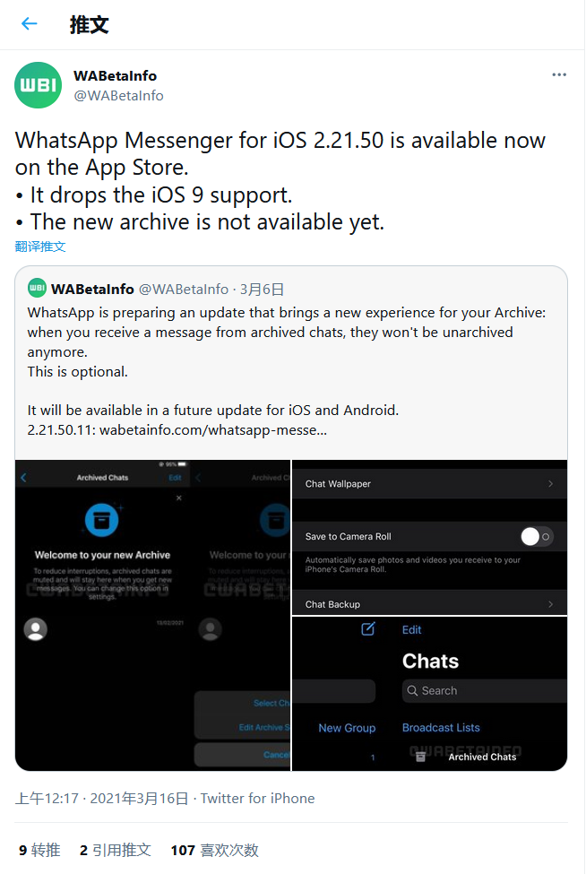 知名即时通讯软件 WhatsApp 近日更新( iOS 2.21.50 )的支持文档中,宣布将停止对 iOS 9 以及此前旧版本的支持。也就是说,如果你依然在使用 iOS 9 的旧款苹果设备,那么你需要升级系统或者设备才能继续使用该软件了。伴随着对 iOS 9 支持的结束,iPhone 4s 上将无法运行 WhatsApp 了。