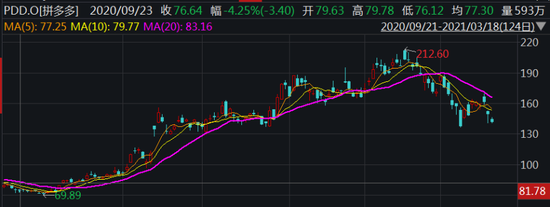 3月17日,拼多多以每股152.40美元低开,最终收盘于149.46美元,较前一个交易日下挫7.1%。次日,该股再度下挫5.11%,收于每股141.82美元一连两件大事发生在成立仅6年的拼多多股份有限公司(下称拼多多)身上。