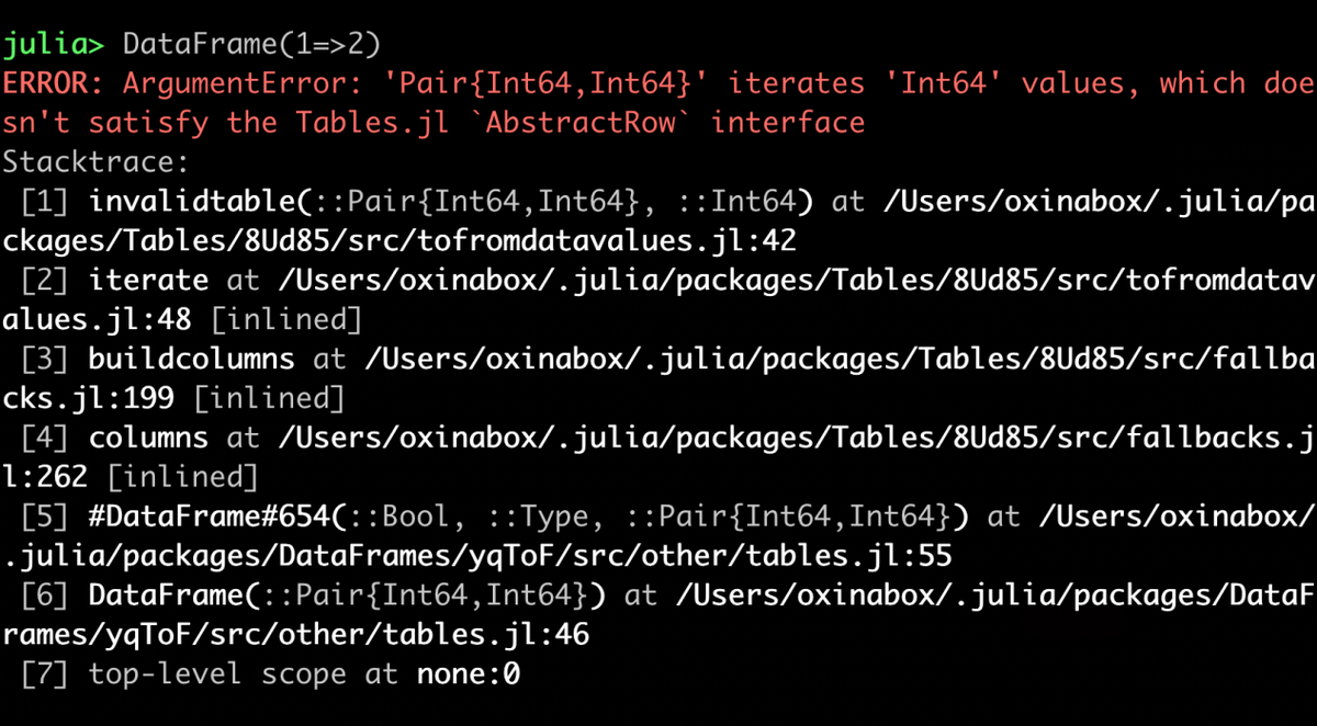 早在Julia版本0.6中,对堆栈跟踪的格式进行了大修 ,在该版本中在这方面做了进一步的改进。新旧的堆栈跟踪打印的对比示例,如下