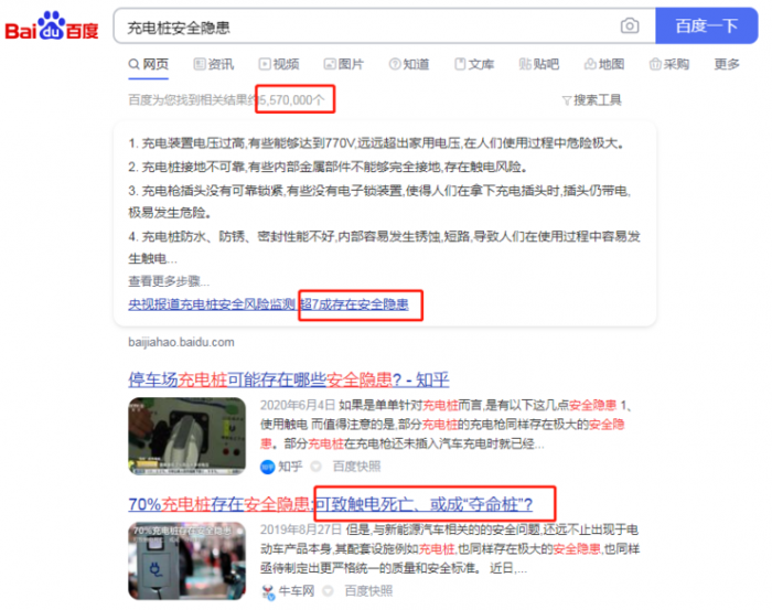 百度搜索“充电桩安全隐患”,有超出550万的搜索结果,其中置顶的几条消息中,明确指出超过7成充电桩存在安全隐患,可致触电死亡,或成“夺命桩”。
