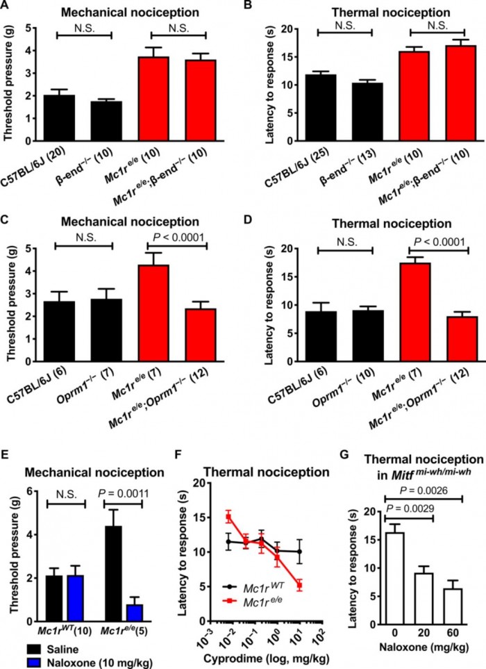 在红毛小鼠中(因此,也可能是人类),拥有这两种激素的低水平似乎会相互抵消。然而,身体也会产生额外的、非黑素细胞相关的因子,这些因子会激活参与阻断疼痛的阿片受体。因此,较低水平的黑色素细胞相关激素的净效应是更多的阿片信号,从而提升了疼痛的阈值。