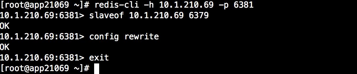连入6380数据库,使用redis-cli -h 10.1.210.69 -p 6380,其中-h代表ip地址,-p代表端口,并执行slaveof 10.1.210.69 6379,并写入配置文件config rewrite,如下:
