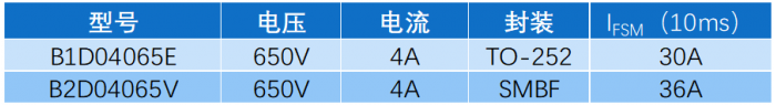 基本半导体TO-252封装B1D04065E型号碳化硅肖特基二极管已在PD行业批量应用,此次新推出的SMBF封装B2D04065V产品与之相比具有更低的正向导通电压(参见表2)。