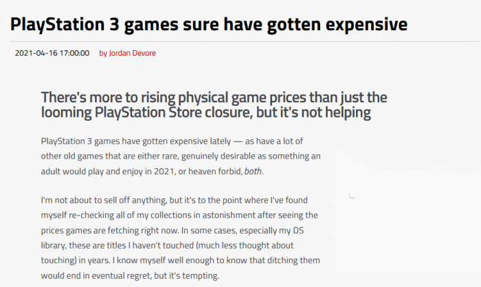 根据destructoid以及resetera的报道,,PS3二手市场实体游戏游戏价格涨幅比较大,经典游戏《瑞奇与叮当合集》实体版价格涨幅超出2倍,《异魂传承(Folklore)》价格基本翻了好几倍,该作虽然没有数字版,但是也因为索尼的消息,价格也受到了影响。