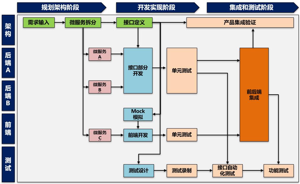 如上图,大家遵循同样的接口契约,那么后端开发,前端开发和测试人员可以并行开始各自的工作。对于前端优先进行接口开发和实现,前端则通过接口契约产生Mock模拟,通过接口模拟实现来进行前端功能的开发。在前后端开发过程中,测试人员也可以根据接口定义进行测试设计工作,同时进行相关的测试脚本设计或录制工作。