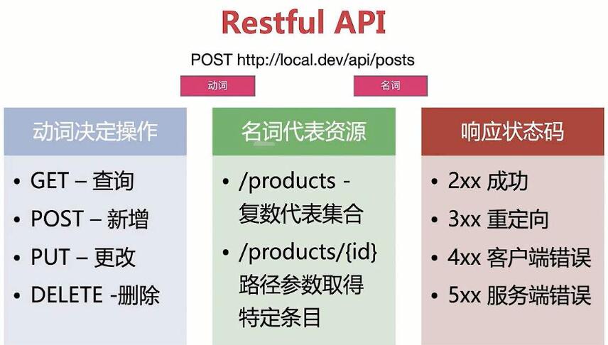 具体来说,就是HTTP协议里面,四个表示操作方式的动词:GET、POST、PUT、DELETE。它们分别对应四种基本操作:GET用来获取资源,POST用来新建资源(也可以用于更新资源),PUT用来更新资源,DELETE用来删除资源。