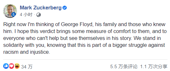 Facebook首席执行官马克·扎克伯格说,他对乔治·弗洛伊德和他的亲人表示同情。"扎克伯格在Facebook上发文说:"我希望这个判决能给他们带来某种程度的安慰,也希望每个人都能在他的故事中看到自己。"我们与你们站在一起,知道这是反对种族主义和不公正的更大斗争的一部分。"