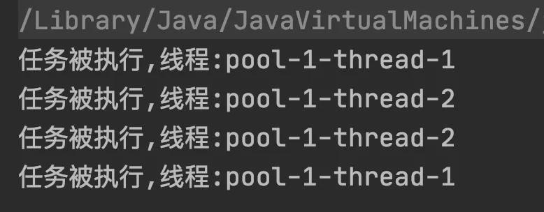 public static void fixedThreadPool() { // 创建 2 个数据级的线程池 ExecutorService threadPool = Executors.newFixedThreadPool(2); // 创建任务 Runnable runnable = new Runnable() { @Override public void run() { System.out.println("任务被执行,线程:" + Thread.currentThread().getName()); } }; // 线程池执行任务(一次添加 4 个任务) // 执行任务的方法有两种:submit 和 execute threadPool.submit(runnable); // 执行方式 1:submit threadPool.execute(runnable); // 执行方式 2:execute threadPool.execute(runnable); threadPool.execute(runnable); } 执行结果如下: