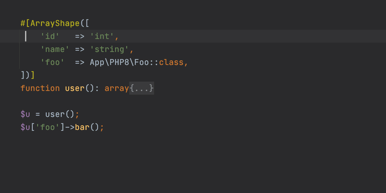 #[ArrayShape([ // ‘key’ => ’type’, ‘key1’ => ‘int’, ‘key2’ => ‘string’, ‘key3’ => ‘Foo’, ‘key3’ => App\PHP 8\Foo::class, ])] function functionName(...): arraytype可以被指定为一个字符串或作为在FQN字符串或形式的类引用::class常量。