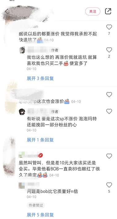 甚至有玩家在得知泡泡玛特新品涨价后,立刻发帖表示弃坑。“再见吧那就,本来就贵,还要涨价”“据说以后的都要涨价,我觉得我承担不起,快退坑了。”