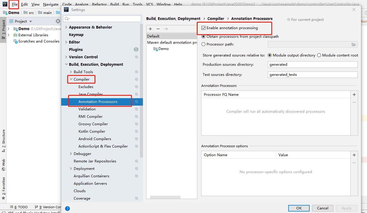 2、点击File-- Settings设置界面,开启 AnnocationProcessors如下图: