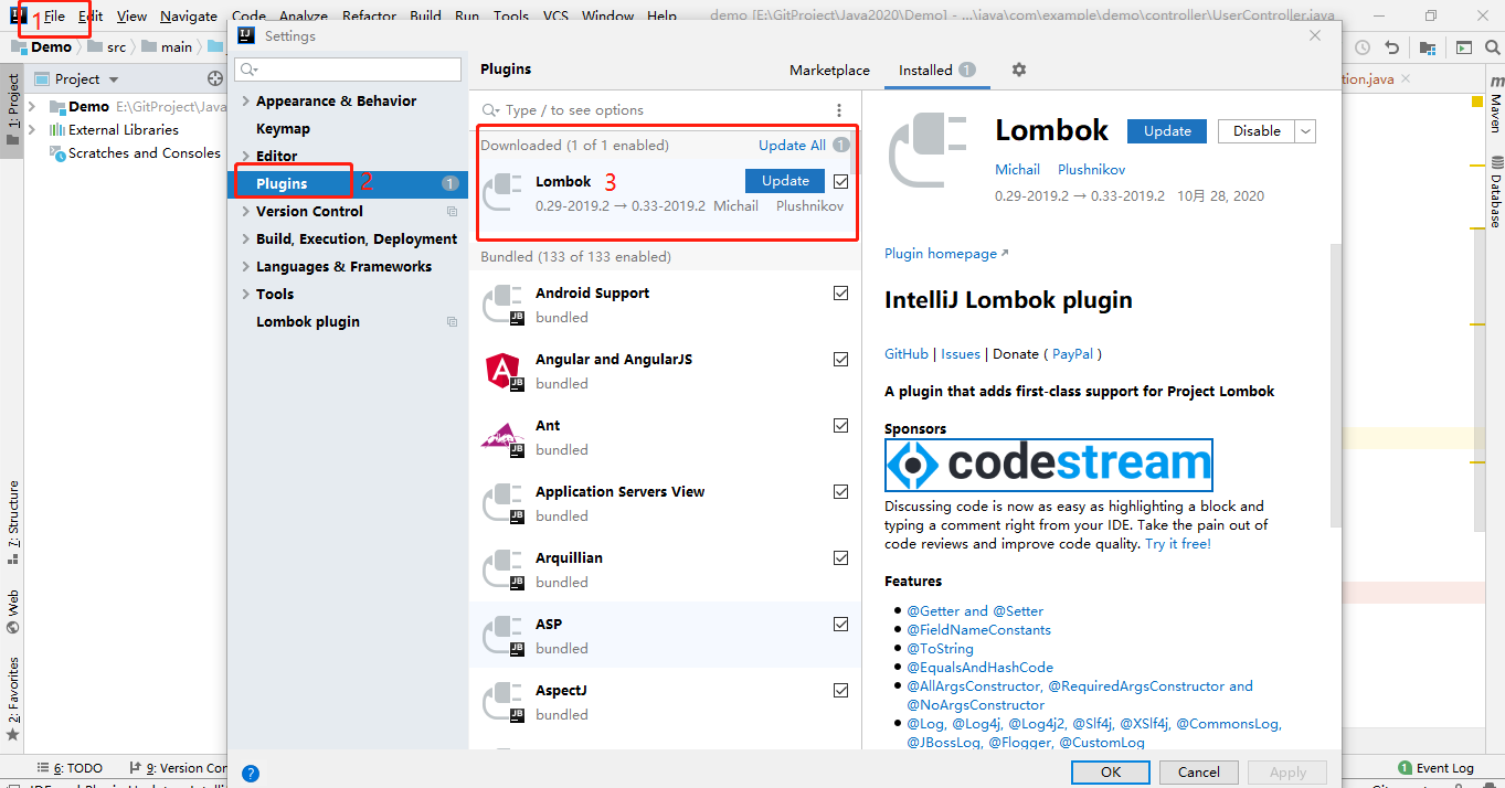 1、工具栏点击File→Settings设置界面→找到Plugins→找到Lombok插件然后点击install→重启IDEA,安装Lombok插件如下图: