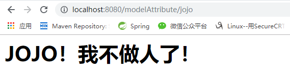 @Controller @RequestMapping("/modelAttribute") public class ModelAttributeController { @RequestMapping("/jojo") @ModelAttribute("attributeName") public String jojo() { return "JOJO!我不做人了!"; } } 这种情况下RequestMapping方法的返回的值就不是JSP视图了。而是把返回值放入Request域中的属性值,属性名为attributeName。视图则是RequestMapping注解上的URL,所以创建一个对应的JSP页面: