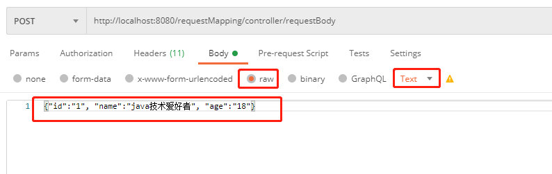 @RequestMapping(value = "/requestBody", method = RequestMethod.POST) public String requestBody(@RequestBody User user) { return user.toString(); } 注意的是,要使用POST请求,发送端的Content-Type设置为application/json,数据是json字符串: