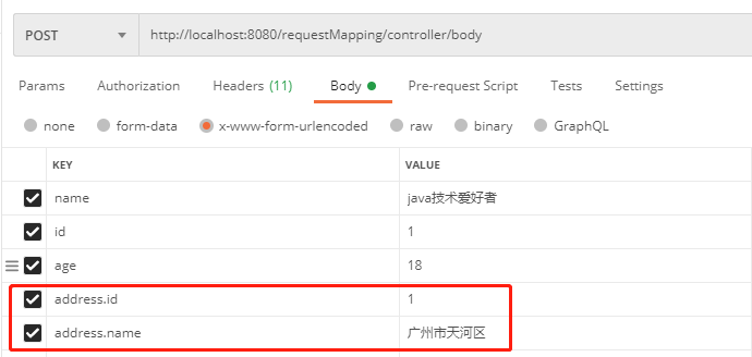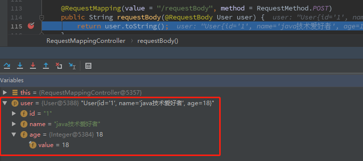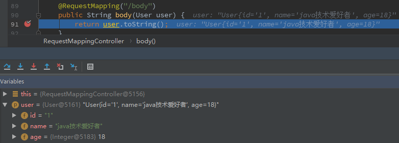 @RequestMapping("/body") public String body(User user) { return user.toString(); } 只要请求参数与属性名相同自动填充到user对象中: