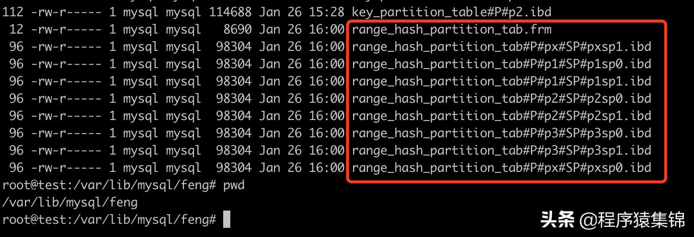 drop table if exists list_key_partition_tab; create table list_key_partition_tab( id int auto_increment, type int, create_date date, col1 varchar(16), col2 int, primary key(id,create_date,type) ) partition by list columns(type) /*根据type的值拆分为2个列表分区*/ subpartition by key(create_date) /*根据create_date进行按键分区*/ subpartitions 2 /*每个分区再根据create_date拆分为2个按键子分区*/ ( partition p1 values in (1, 3, 5, 7, 9), partition p2 values in (2, 4, 6, 8, 10) ); 创建好表之后,可以在磁盘上看到如下数据文件: