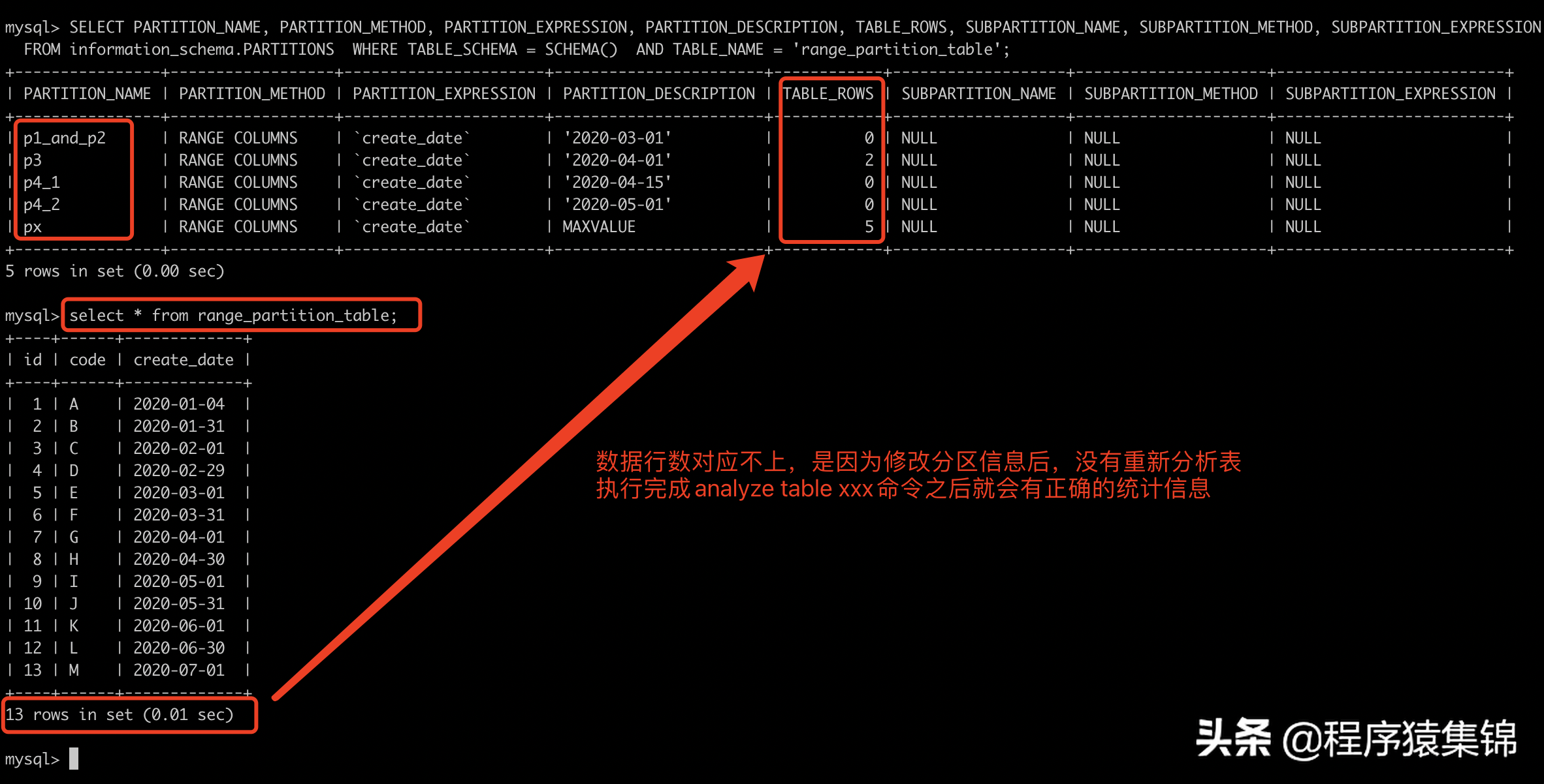 alter table range_partition_table reorganize partition p4 into ( partition p4_1 values less than('2020-04-15'), partition p4_2 values less than('2020-05-01') ); 经过上面两步合并和拆分分区的操作之后,结果如下。我们可以看到分区p1和p2已经合并为一个分区p1_and_p2。分区p4也被拆分成了两个分区:p4_1和p4_2。但是每一个分区的数据量重下面的截图中可以看到还有些不对,但是我们把分区表执行一下分析命令之后就可以看到正确的统计结果了。