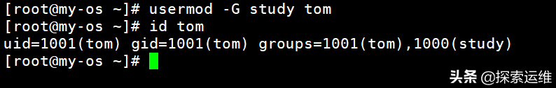 # 修改添加附件组 [root@my-os ~]# usermod -G study tom [root@my-os ~]# id tom uid=1001(tom) gid=1001(tom) groups=1001(tom),1000(study)