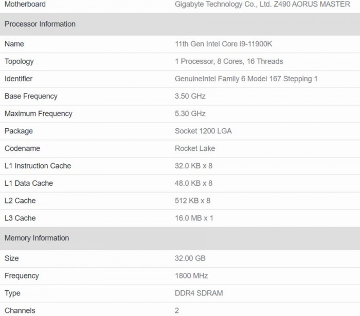 根据 GeekBench 跑分库的芯片排行,还没有一款桌面 CPU 能够在单核跑分中超过 1900 分。不过近期有用户在技嘉 Z490 Aorus Master 主板和 32GB DDDR-3600 内存上对 Core i9-11900K 进行了测试。在这样的配置下,CPU 终于打破了这一障碍。