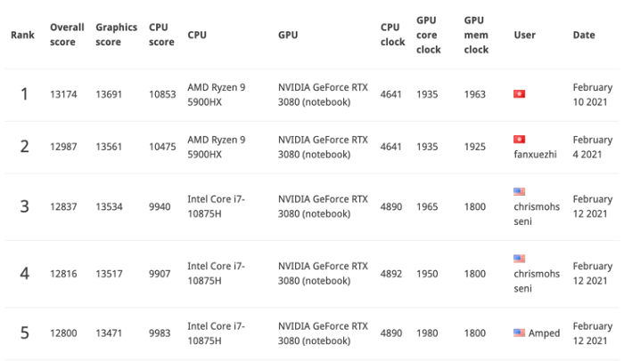在这套刷 VBIOS 结果 TGP 功耗的方案被更多人知晓后,该机已经频繁登上 3DMark 基准测试的榜单前列(目前以 13174 的总得分居于第 2)。