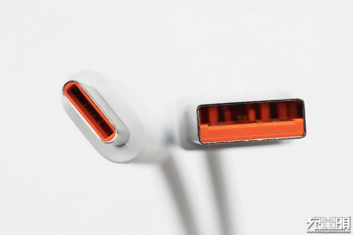 小米55W附带的充电线为 USB-A to USB-C 线,线缆两端做了抗弯折处理,线头塑料壳磨砂处理,方便用户插拔使用。USB-A公头的正负极加宽来通过大电流,中心处设有特殊弹片,颜色为橘红色,有些别致。线缆长度约为 1m,直径为 3.73mm。