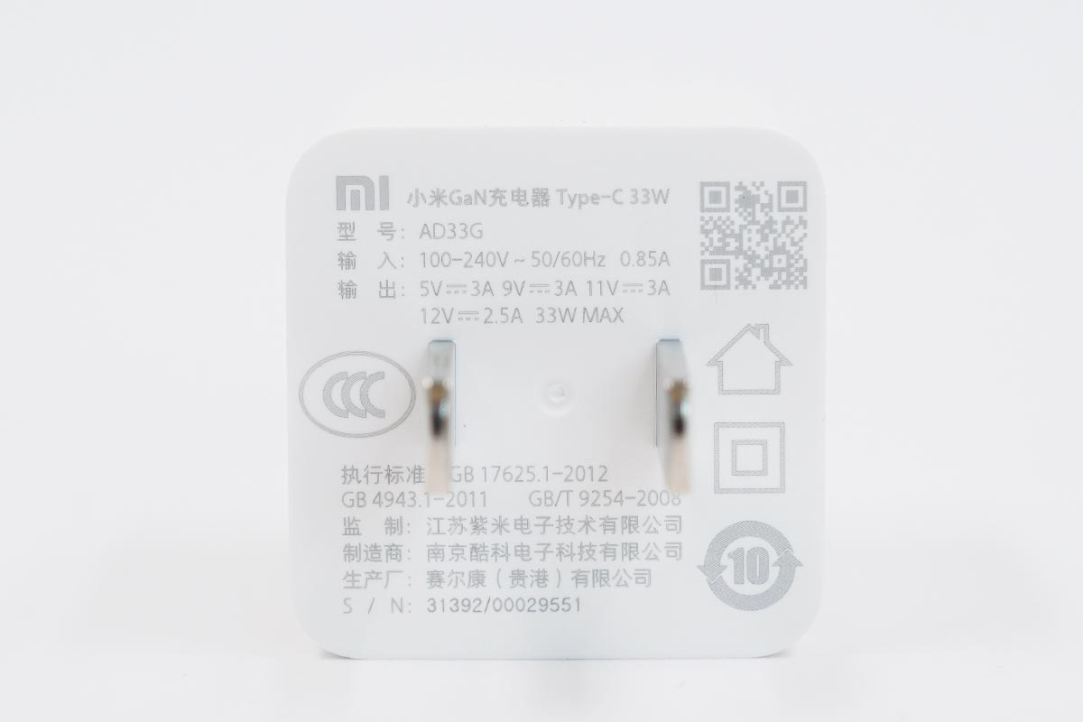 小米33W氮化镓充电器通体白色机身,四周边角过渡圆润,上下两侧削平处理。壳体侧面镭雕了xiaomi 33W的文字信息,在外观上可以大致理解为是小米65W氮化镓充电器的一半。