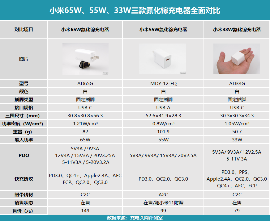 为了方便大家查阅,我们将小米33W、55W、65W三款氮化镓充电器对比内容做成表格。三款产品的发布背景不同,并非直接竞争的关系,从更深层次的意义上来说两者各有优势。