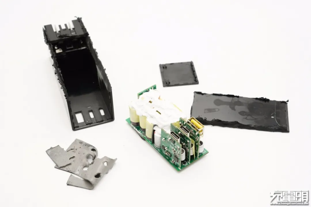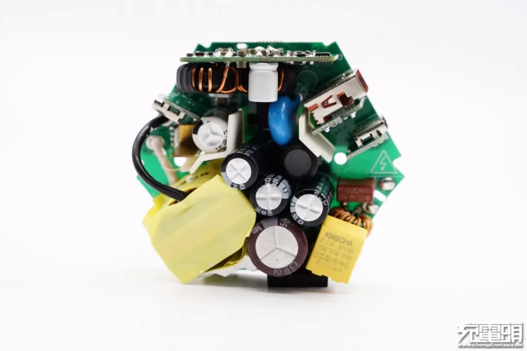 这款产品的内部设计并不算十分复杂,主要由AC转换器和氮化镓三口快充充电器两部分组成。充电器模块采用开关电源加三路DC-DC独立降压输出架构,支持多个主流快充协议,方便外出携带,实用性强。