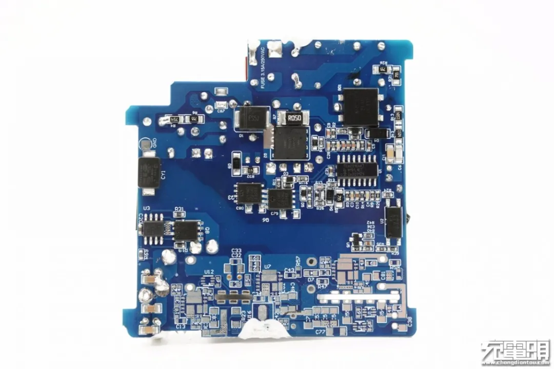 充电头网拆解了解到,这款产品内部采用了高性能、成本的ACF架构以及平面变压器,并且将柱状的输出滤波电容改为贴片电容替代。在结构设计方面,其所采用的平面变压器并不仅仅只是一块PCB板,上面还布局了比较复杂的电路,承载了同步整流的功能,这也是平面变压器的一次创新性应用。