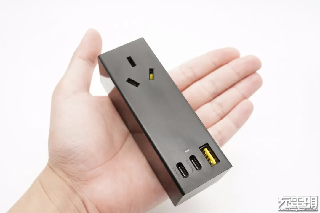 在氮化镓以及巧妙的结构布局下,充电器的功率密度达到了1.05W/cm³,非常小巧,给人一种过目难忘的感觉。
