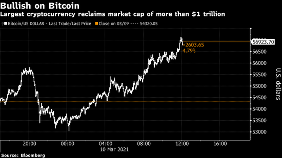 比特币价格连续第四天上涨,在金融市场乐观情绪推动下,比特币总市值重返1万亿美元上方。比特币盘中最高上涨5.2%,截至纽约时间中午12:13,交易价格约为57000美元。 比特币市值首次迈过1万亿美元大关是在今年2月份,当时交易价格为创纪录的58,350美元。