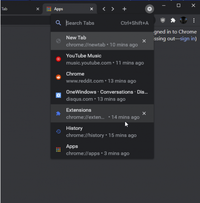 在改进之前,标签搜索菜单很小,只显示五个打开的标签页。这种情况已经改变了,因为Chrome Canary中的这个菜单的高度现在将根据打开的标签页数量和窗口的高度动态调整。如果你打开了 20 个标签页,点击标签页搜索按钮将显示所有 20 个标签页,而不是五个。