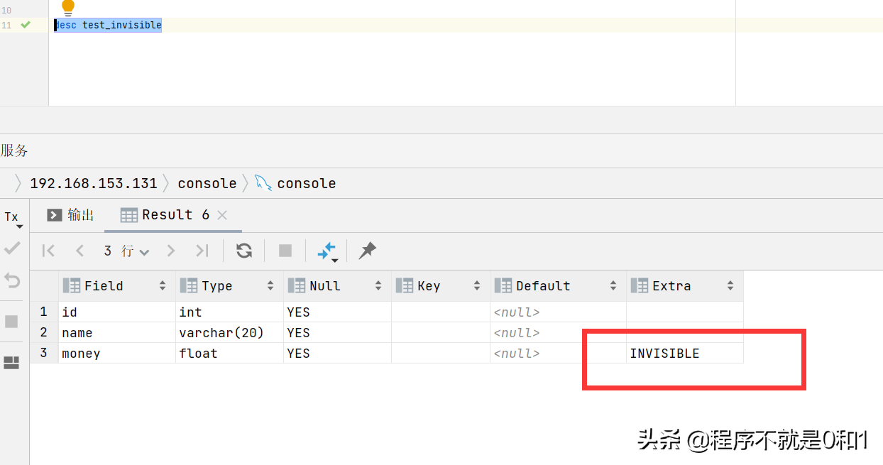 我们来体验一下MySQL 8.0.23新特性:不可见列(invisible 关键字)。传统版本数据库中所有列都是可以查询的,现在可以指定一个不可见的列,它将对查询隐藏。如果显式引用,它可以被查到。1、首先建表create table test_invisible ( id int, name varchar(20), money float in...
